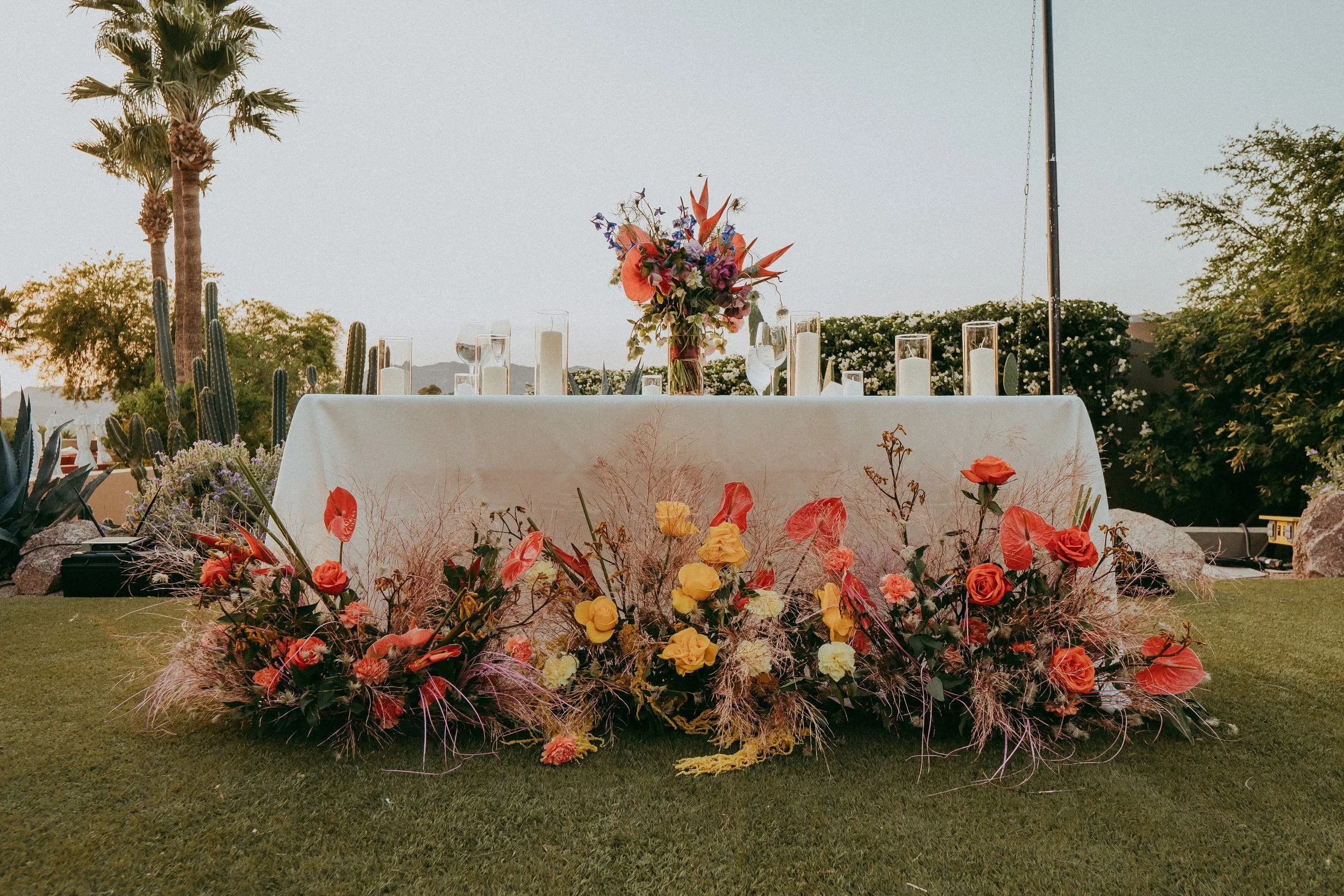 Diving right in - we HAVE to talk about the ceremony aisle. I mean it is SO incredibly fun and refreshing. We typically don't get too many inquiries for a colorful wedding palette so we loved being able to build Sarah's colorful wildflower aisle. She gave us complete creative control when it came to choosing her blooms so we got to mix in some unusual stems like heliconia, anthurium, and the dreamiest nigella blooms. The gorgeous Paradise Valley view in the background for the ceremony at The Sanctuary on Camelback, was just the cherry on top!