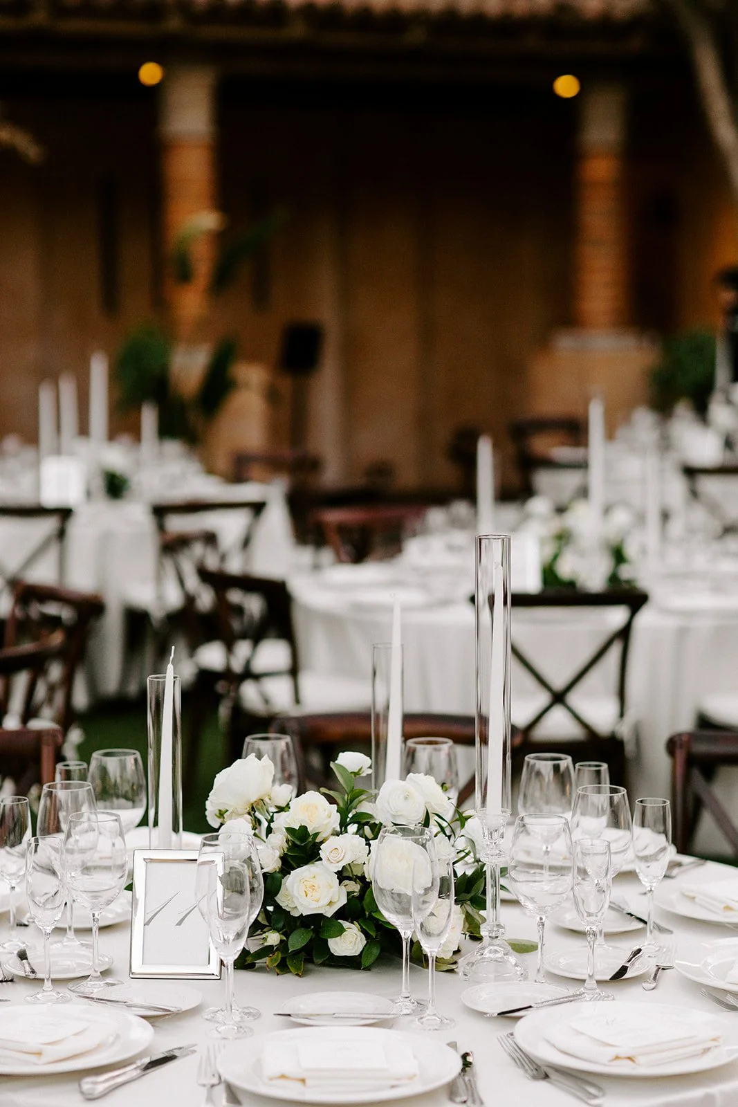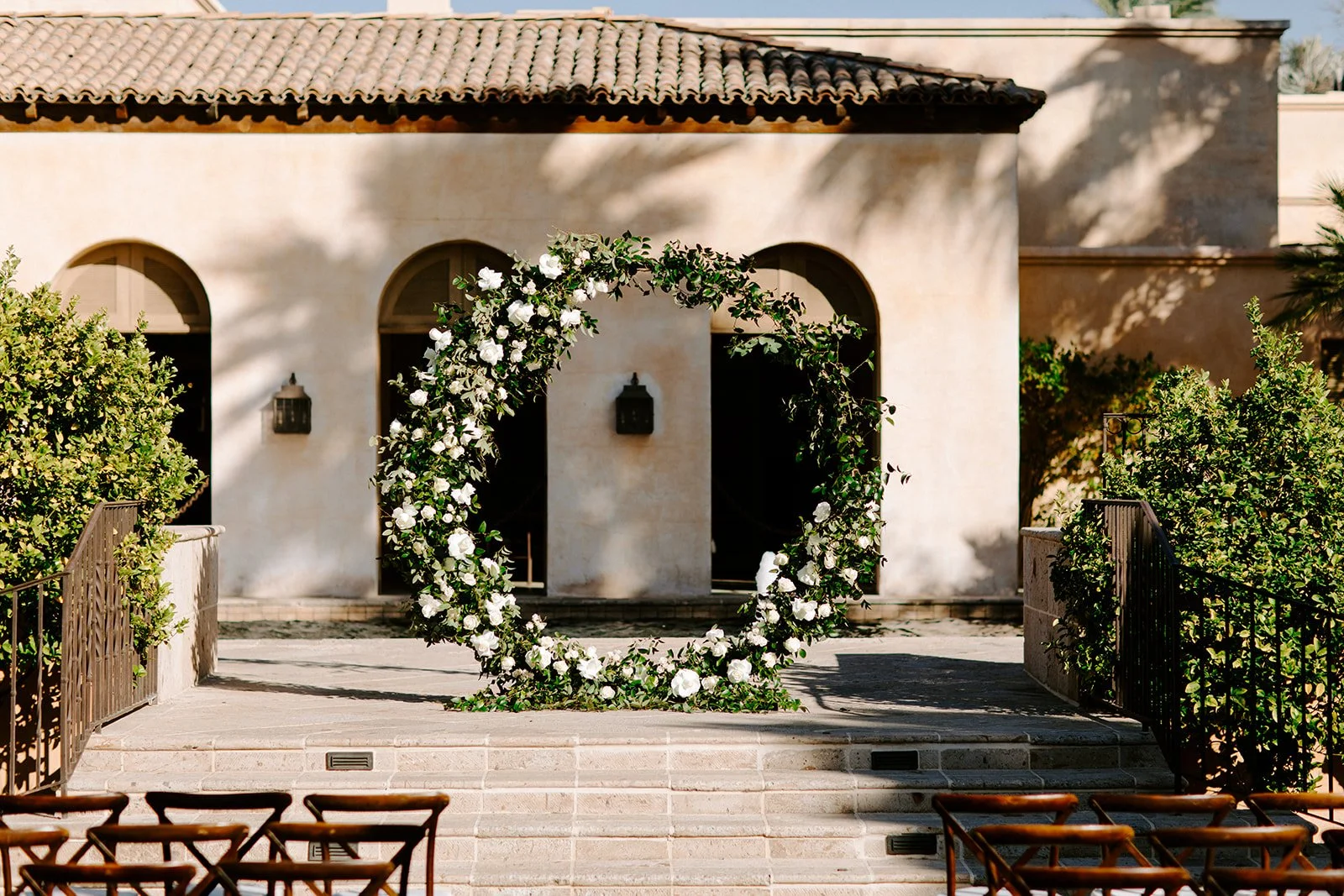 We chose elements that feel modern and fun like their circle arch but kept them timeless by balancing them with white blooms and vining foliage. At the reception, a waterfall garland of greens and white roses highlighted the sweetheart table. Crisp white linens, tall taper candles, votives, and romantic centerpieces rounded out the vision. It was the perfect spring day and we loved bringing it to life!